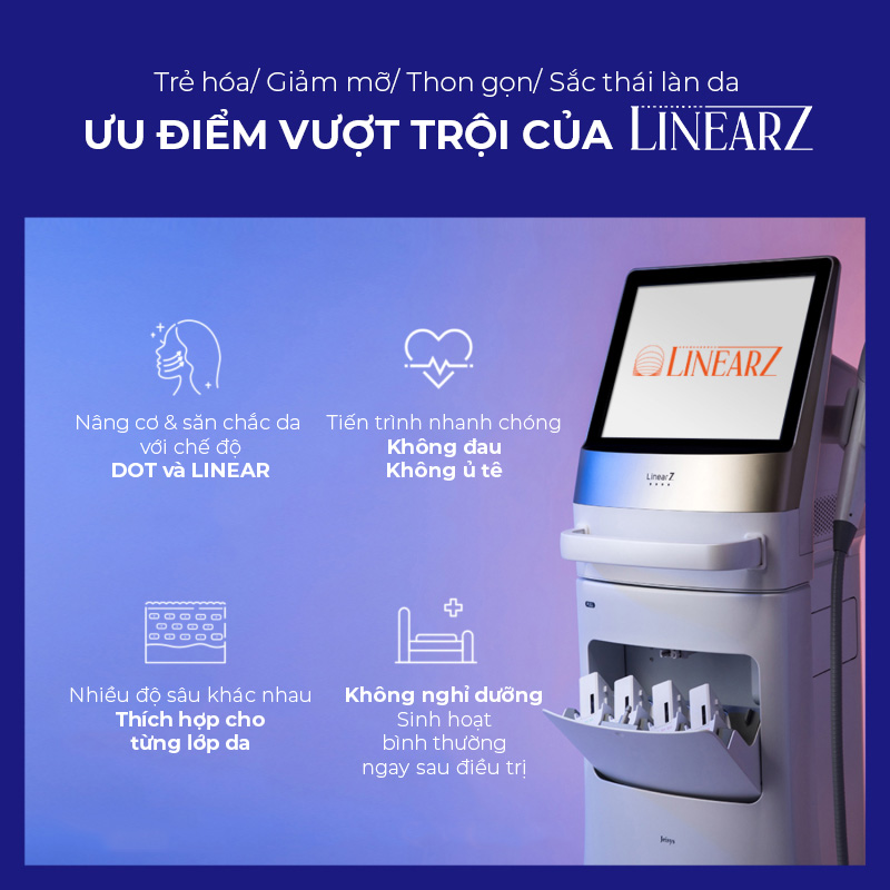 Công nghệ LINEARZ là phiên bản nâng cấp của công nghệ HIFU truyền thống, ứng dụng cơ chế phát sóng siêu âm tuyến tính (linear) kết hợp DOT (điểm nhiệt) và LINEAR (hàng nhiệt). Nhờ khả năng tạo hàng nhiệt 58 độ C bên dưới da, LINEARZ giúp tiêu hủy mô mỡ và kích thích sản sinh collagen, elastin mạnh mẽ. Kết quả là làn da trở nên săn chắc, thon gọn và nâng cơ rõ rệt ngay sau liệu trình.